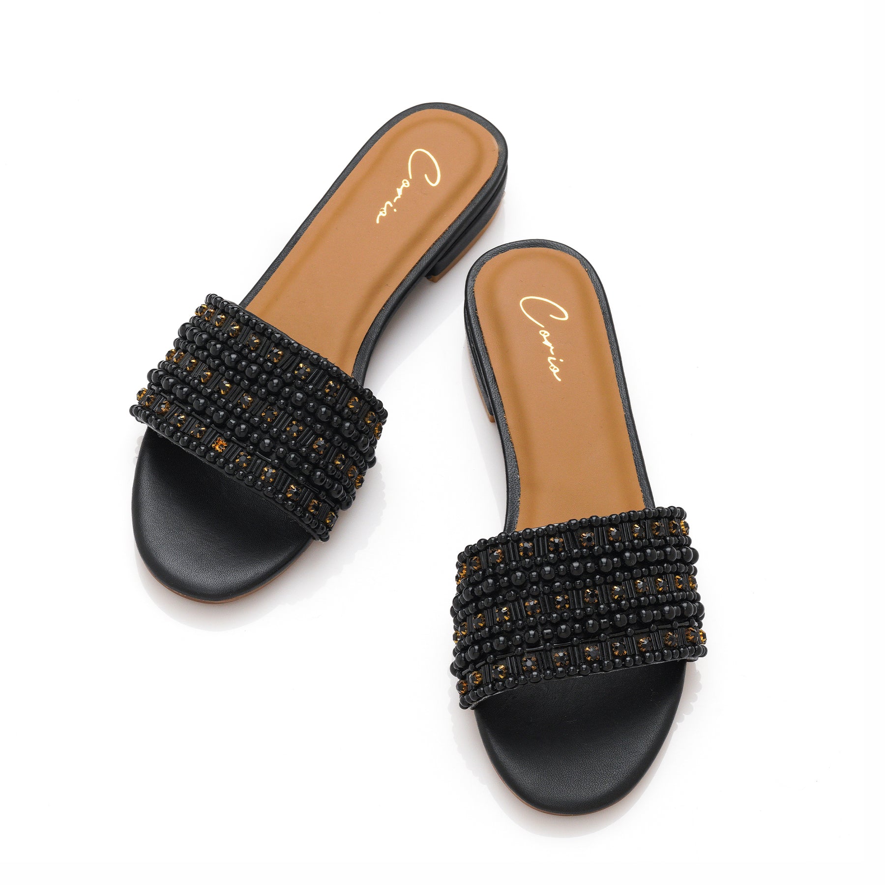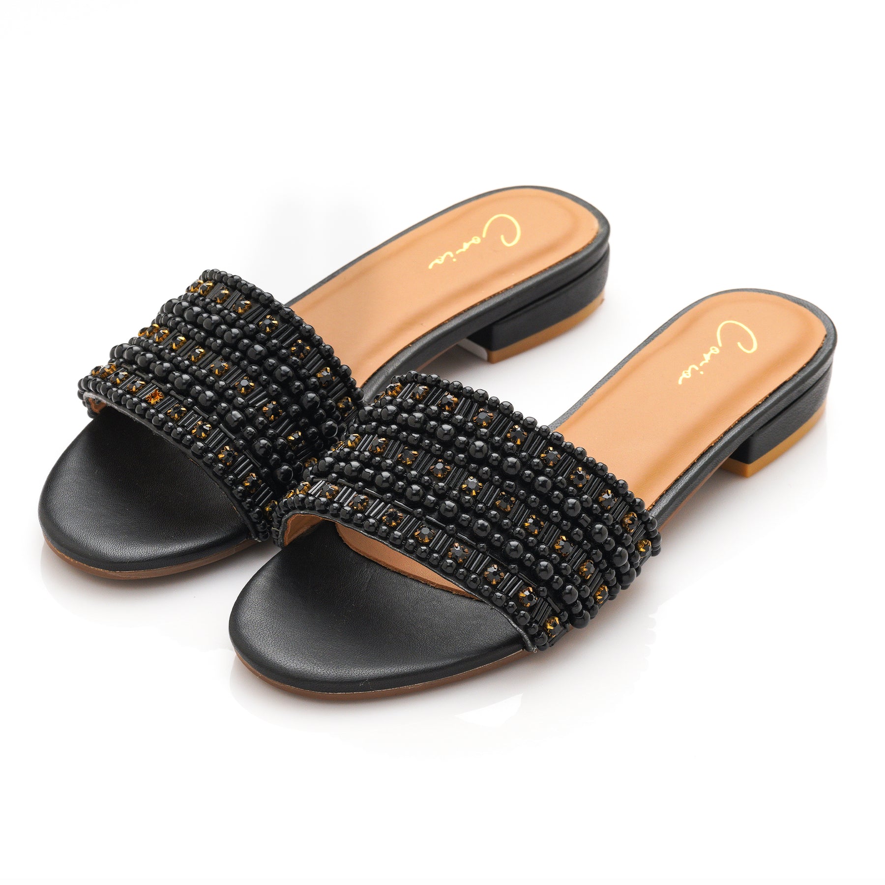A timeless black flats elevated with intricate bead detailing, perfect for effortless style from day to evening.
