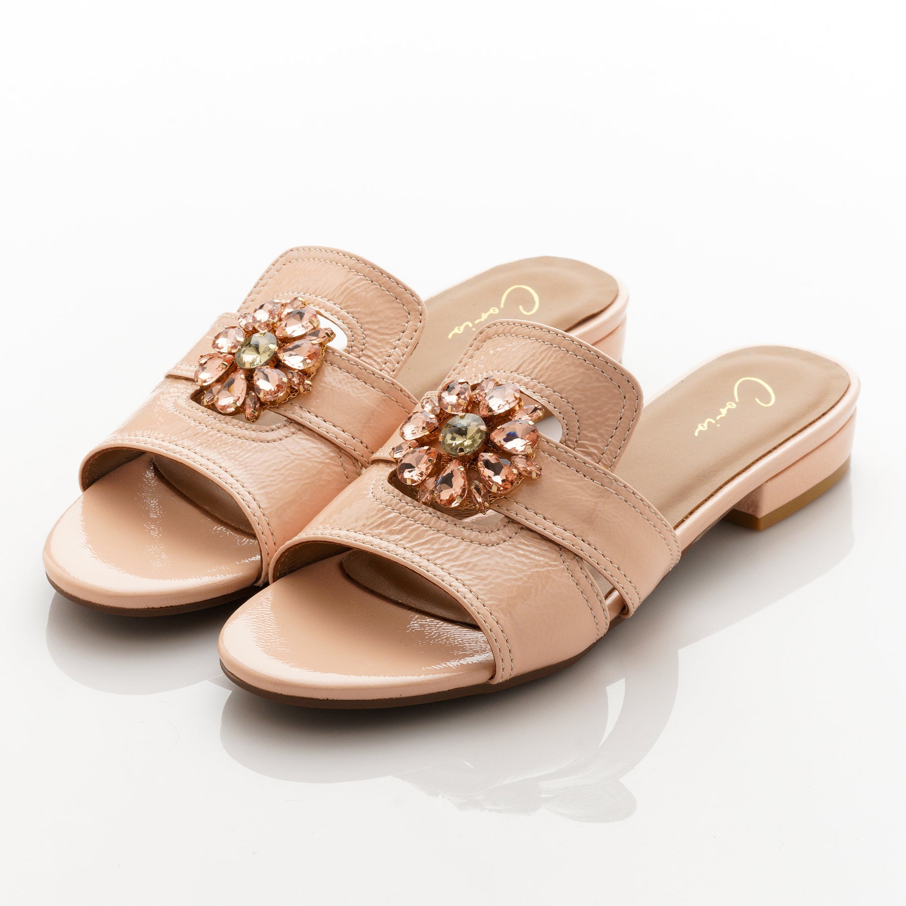 Featuring a glossy finish and vibrant crystal accents, they add a pop of color and sparkle to any look.
