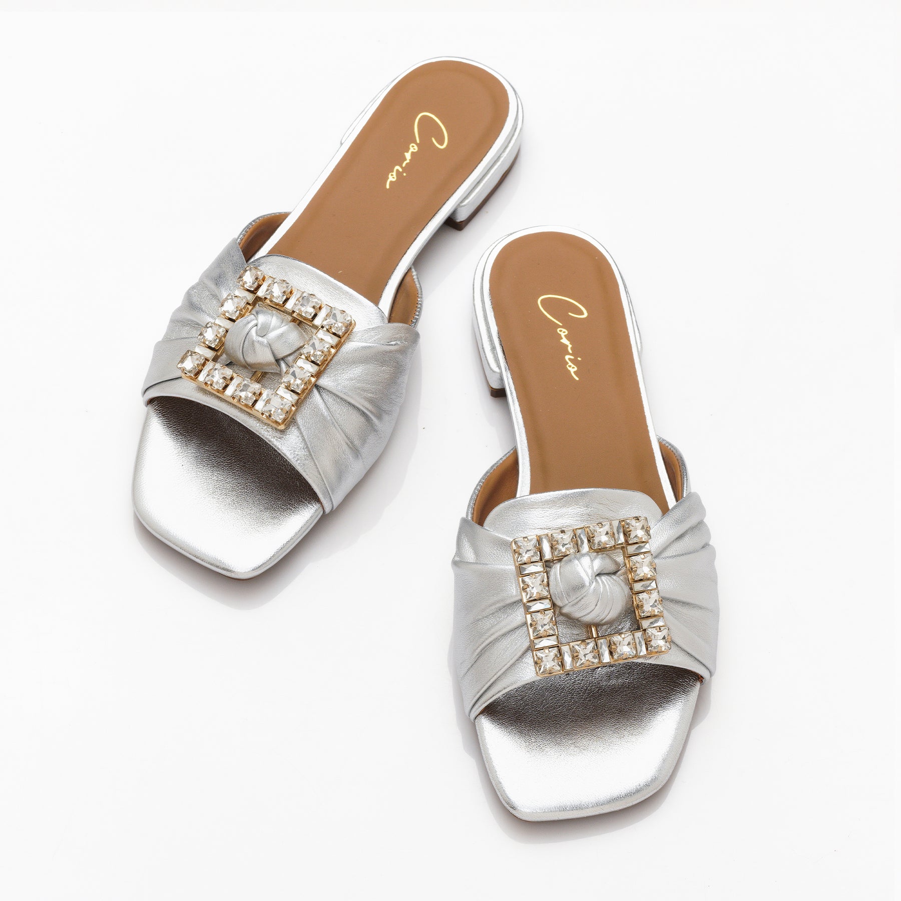 A sleek muted silver sandal with a dazzling diamante buckle, crafted to help you shine with confidence and own every step in style.